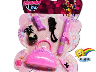 • Set de Beauté Coiffure Fashion Line : 1 flacon vaporisateur, 1 flacon de parfum, 1 peigne, 1 fer à lisser, 1 barrette à cheveux fantaisie, 1 sac à main.
