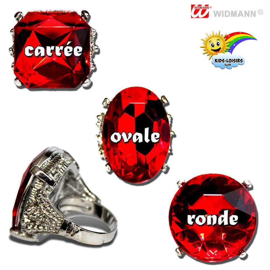 Caillou rouge factice, matière plastique, anneau métallique couleur argent ajustable à toutes les tailles de doigts, taille du diamant : 2,5 cm environ, forme au choix : carrée, ovale ou ronde, (prix unitaire).