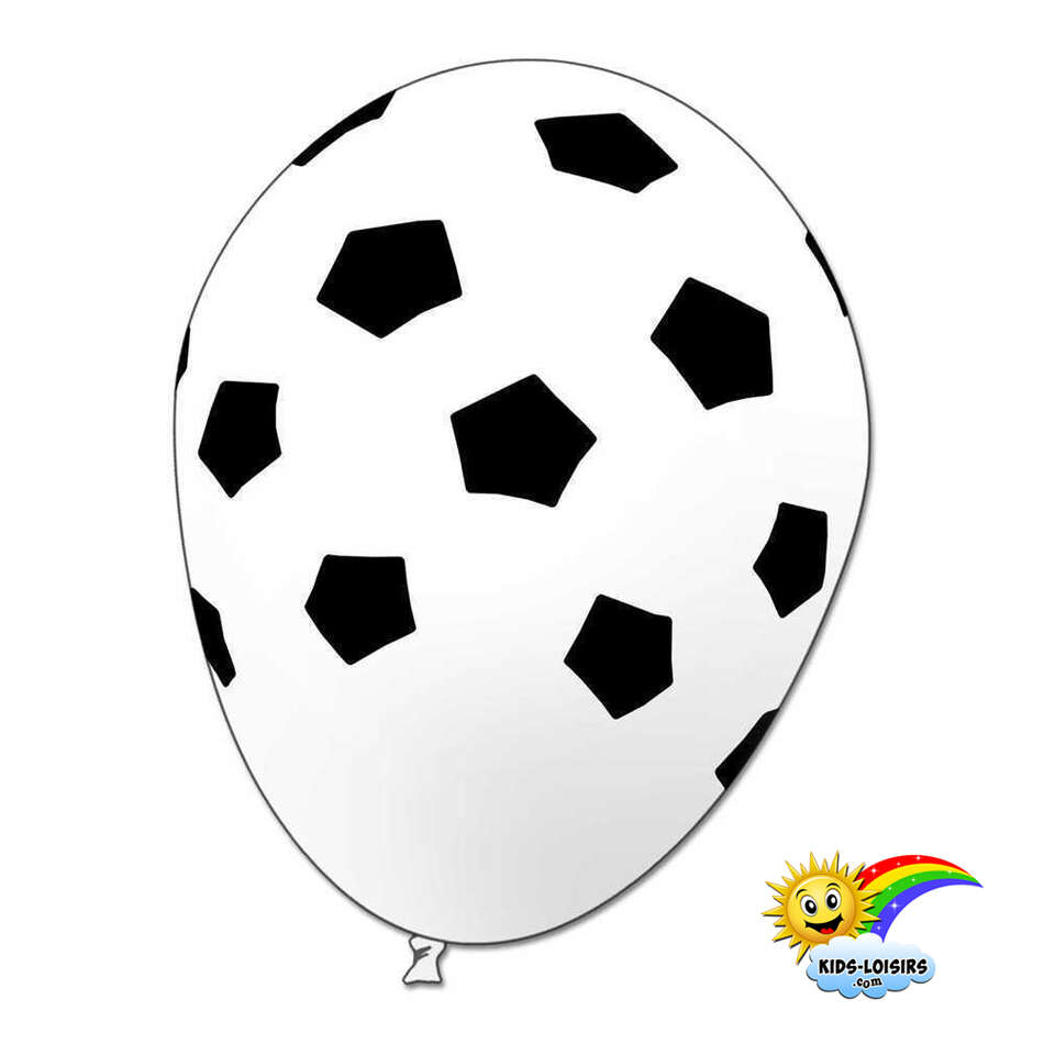 Ballons de baudruche gonflables, imprimés noir sur fond blanc imitant un ballon de football. Qualité supérieure, diamètre standard 30 cm, couleurs vives, conditionnés en vrac dans sachet, quantité au choix, (lot de 10 ou 25 ballons).