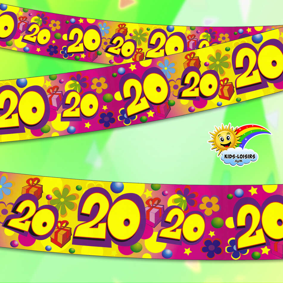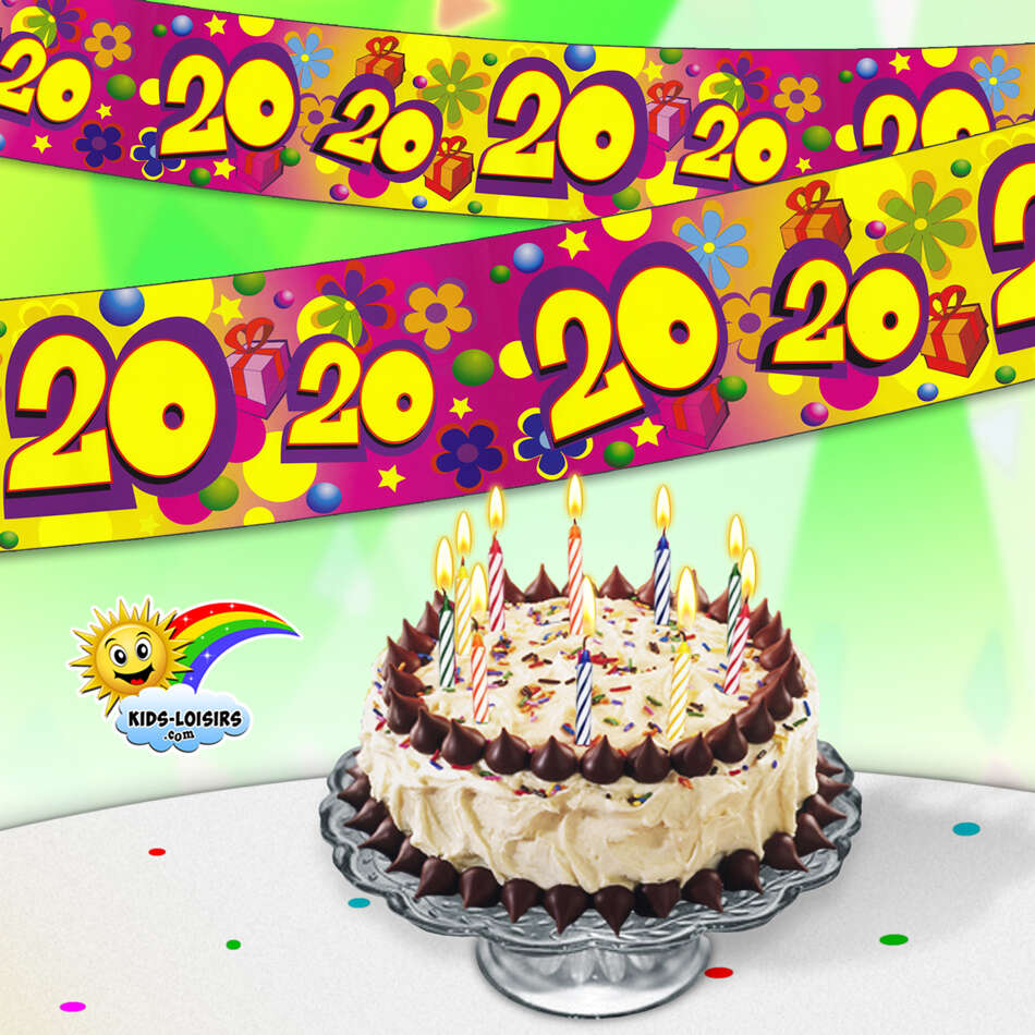 Bannière couleur anniversaire pour les 20 ans, festive et joviale, elle sera du plus bel effet, à fixer à l’aide de punaises, (matière carton glacé, hauteur 16 cm, longueur 2,44 mètres, imprimée sur une seule face, prix unitaire).