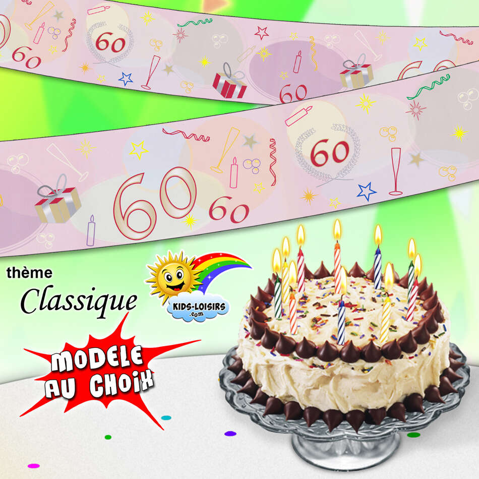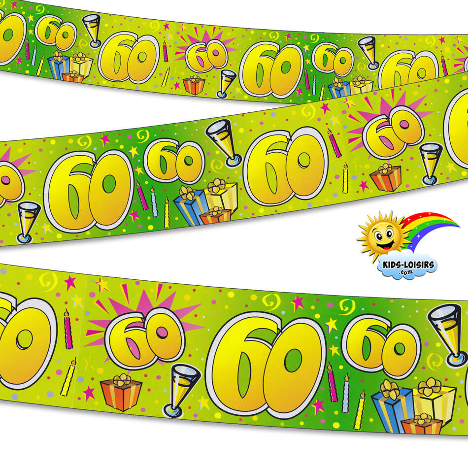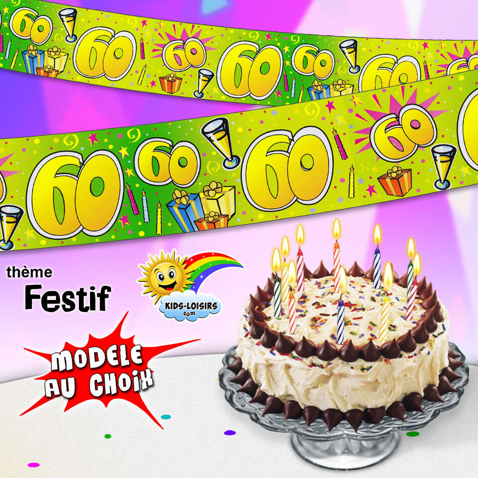 Bannière couleur anniversaire pour les 60 ans, festive et joviale, elle sera du plus bel effet, à fixer à l’aide de punaises. Modèle au choix : thème « classique » plus sobre ou thème « festif » plus coloré, (matière carton glacé, hauteur 16 cm, longueur 2,44 mètres, imprimée sur une seule face, prix unitaire).