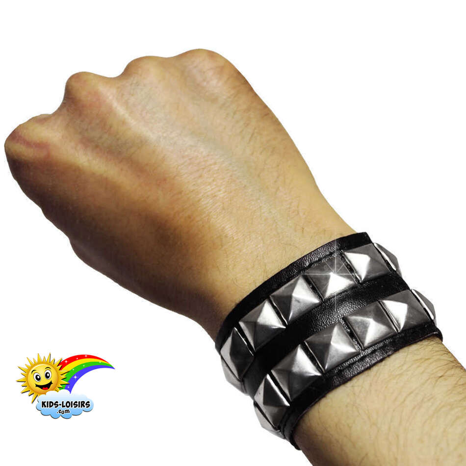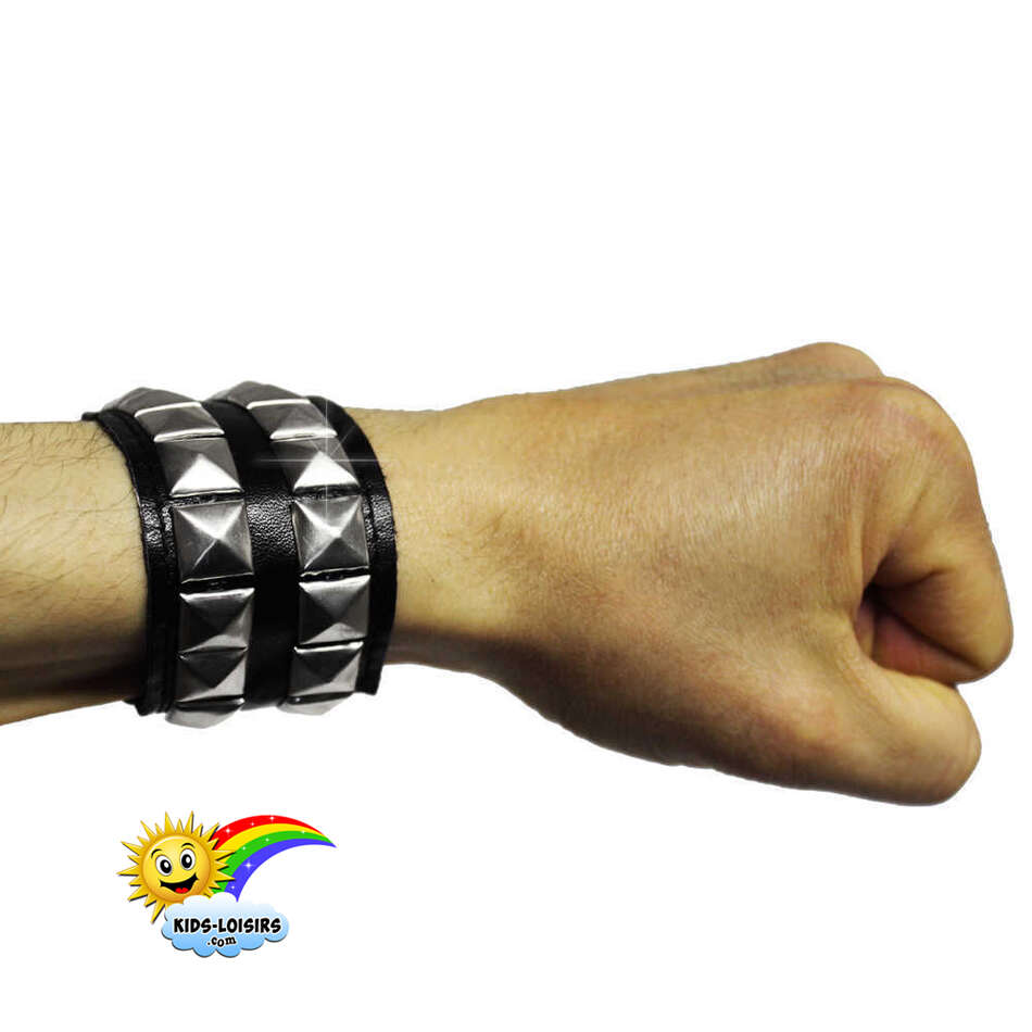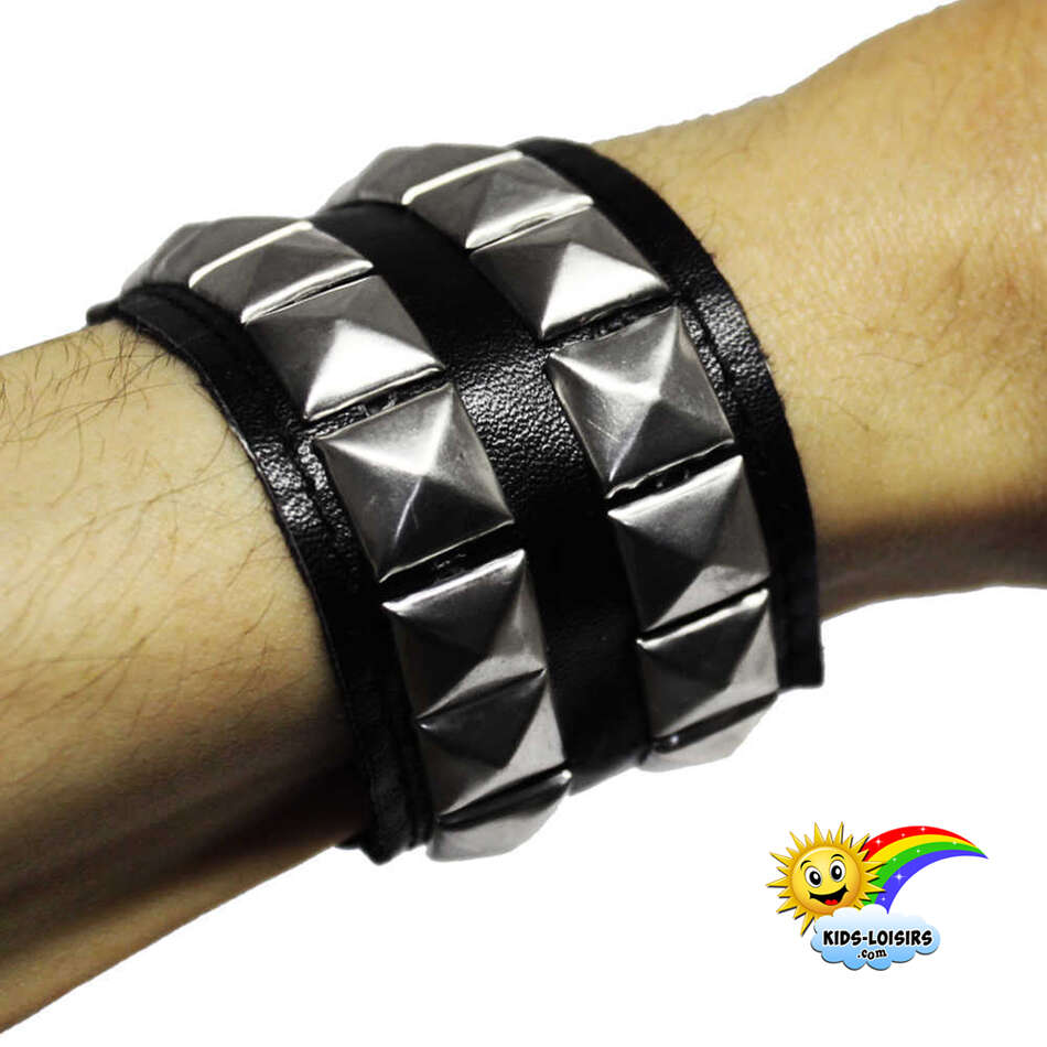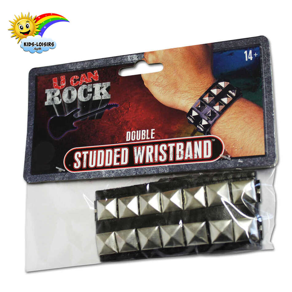 bracelet de force cuir clous studs pointes métalliques carrés punk rockeur emo gothique look style mode accessoire de déguisement double studded wristband noir rebelle dur à cuire