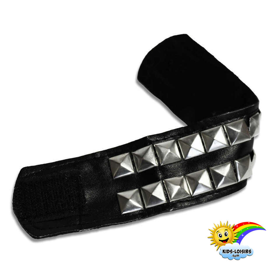 Bracelet avec deux rangs de studs métal, largeur 4 cm, longueur 23 cm, fermeture par bande velcro, accessoire mixte : homme ou femme, taille unique adulte / adolescent.