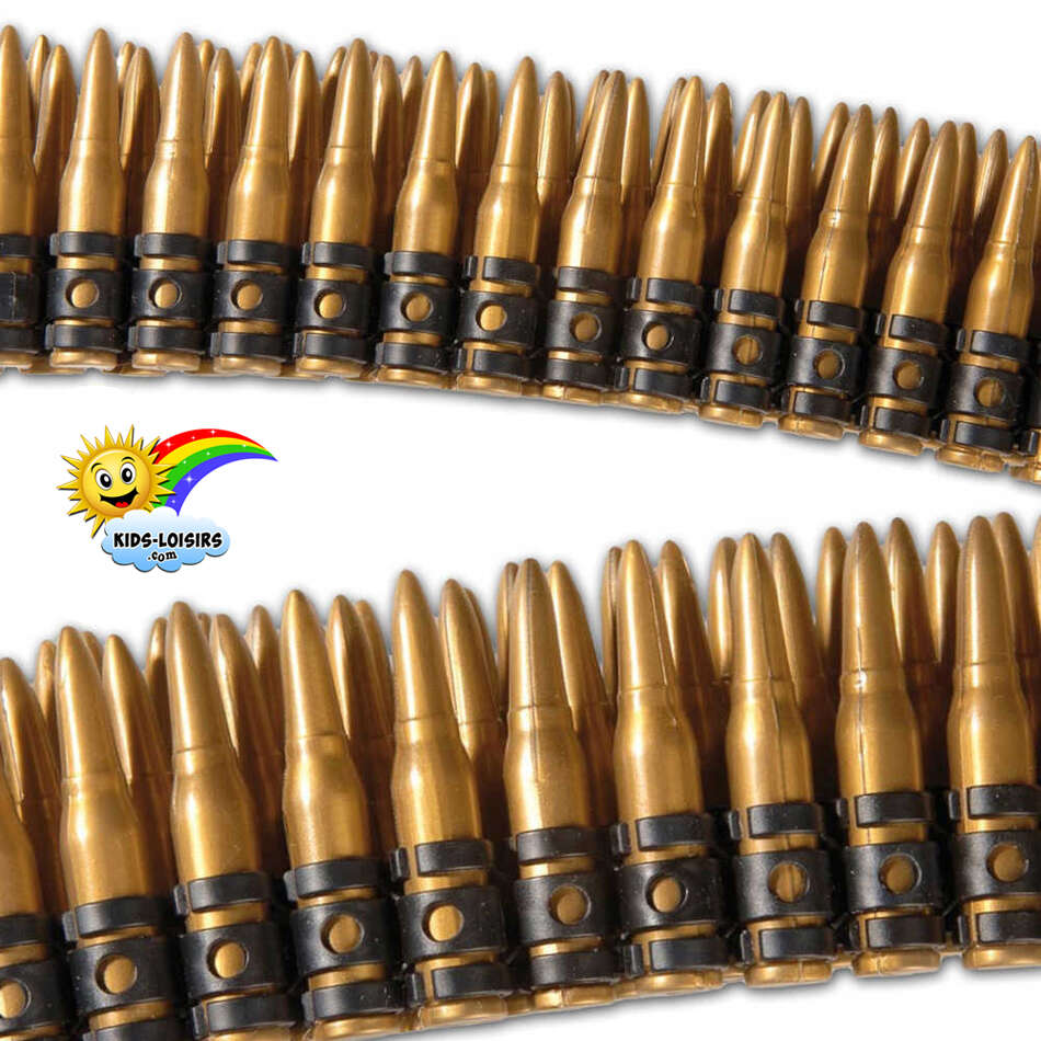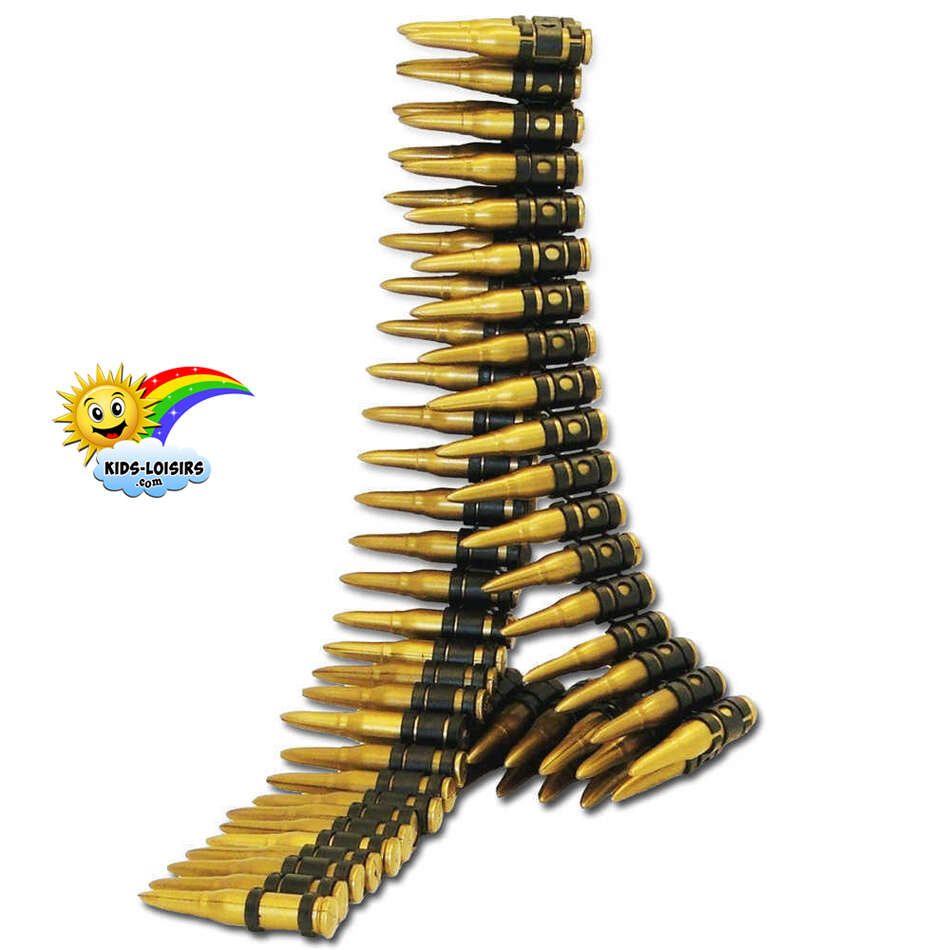 Matière plastique, longueur 1,60 mètre, entièrement démontable, contient 95 munitions environ, indépendantes et amovibles chacune de longueur 7 cm et d’un diamètre à la base de 1,3 cm (13 mm), très belle imitation, effet réaliste.