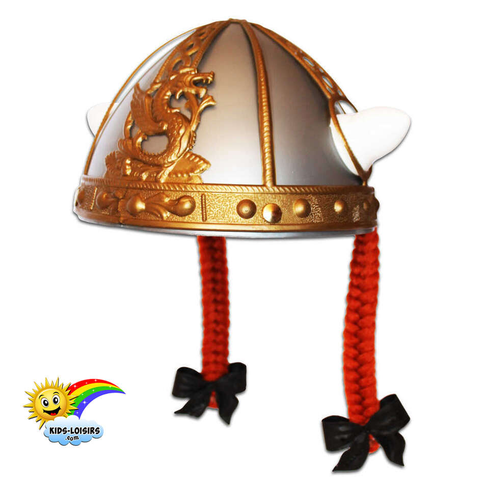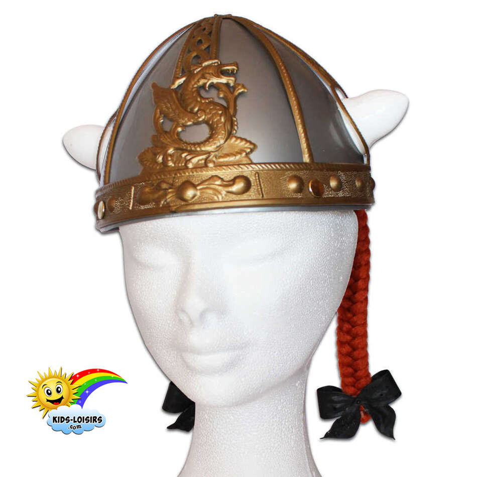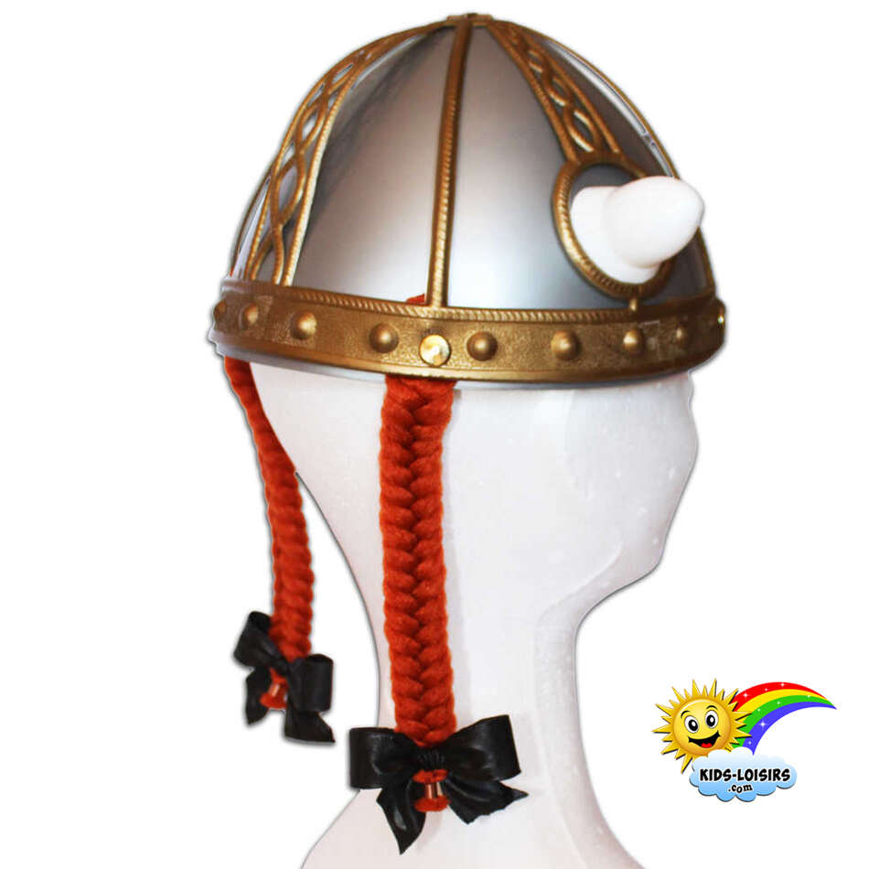 Casque à petites cornes et à nattes tressées, matière plastique, imitation métal, qualité supérieure. Taille unique pouvant convenir aux adultes comme aux enfants. Tour de tête 57 cm sur le rebord le plus large, longueur de chacune des nattes : 19 cm