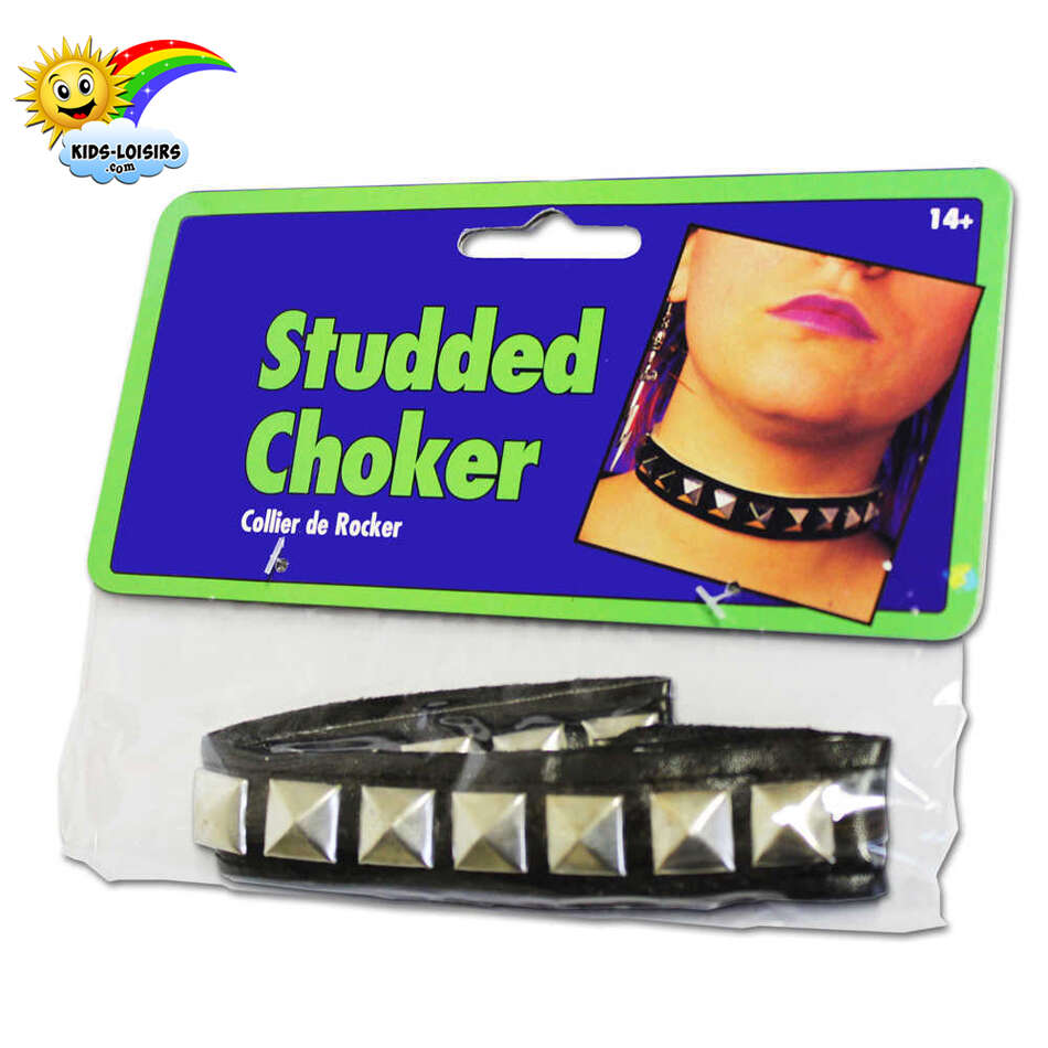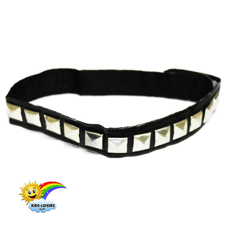 Collier avec un rang de studs métal, largeur 2,5 cm, longueur 42 cm, fermeture par bande velcro, accessoire mixte : homme ou femme, taille unique adulte / adolescent.