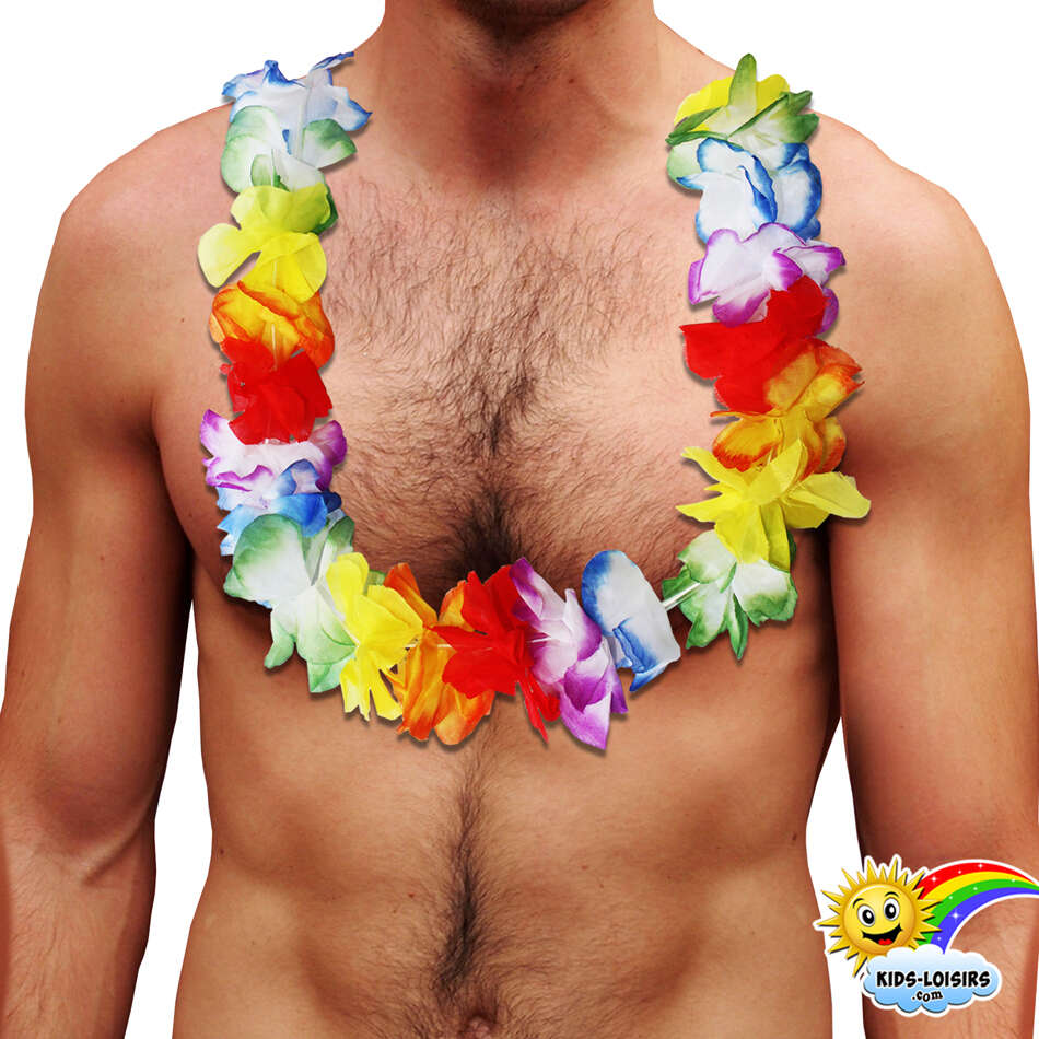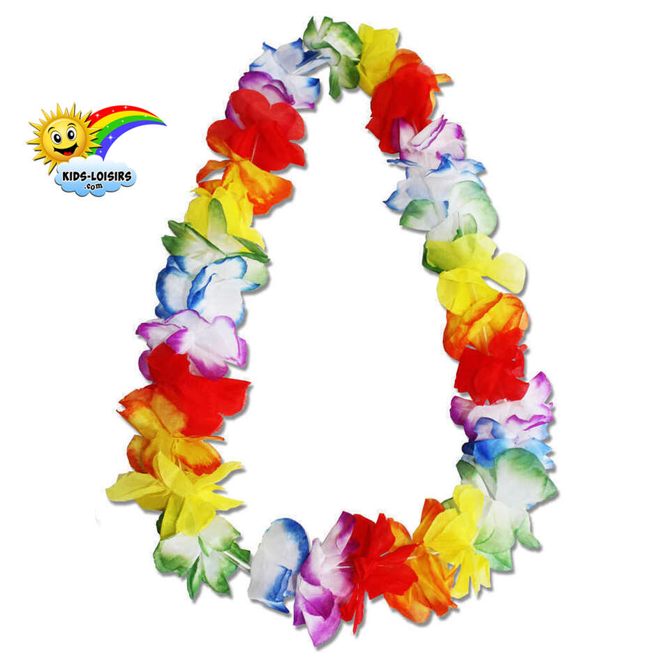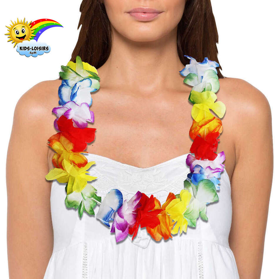 collier fleuri hawaïen multicolore pétales de fleurs artificielles fêter mariage accessoire de déguisement vacances île paradisiaque océan pacifique orchidées polynésie bermudes hawaii honolulu théâtre bronzette soleil palmiers cocotiers surf sable fin plage