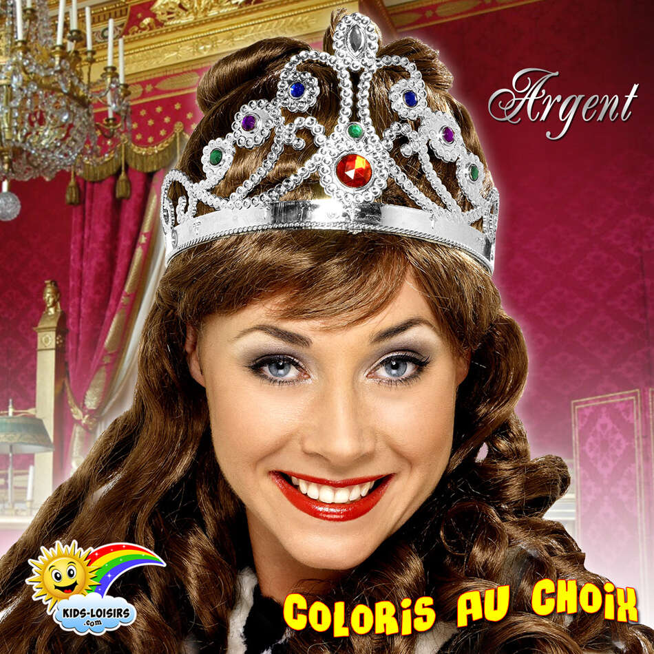 Diadème en plastique semi souple, rubis et saphirs factices, hauteur couronne 12 cm, tour de tête réglable de 50 à 58 cm. Coloris au choix : argent ou dorée, prix unitaire. »  »