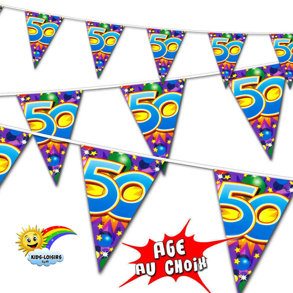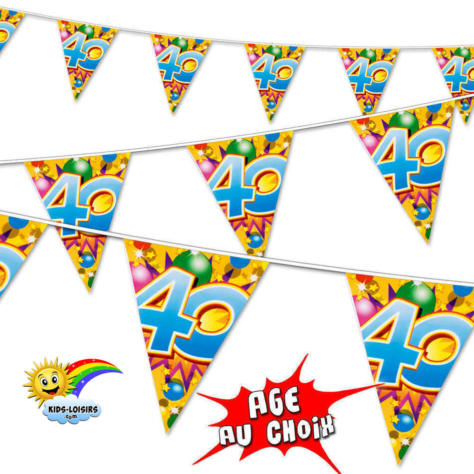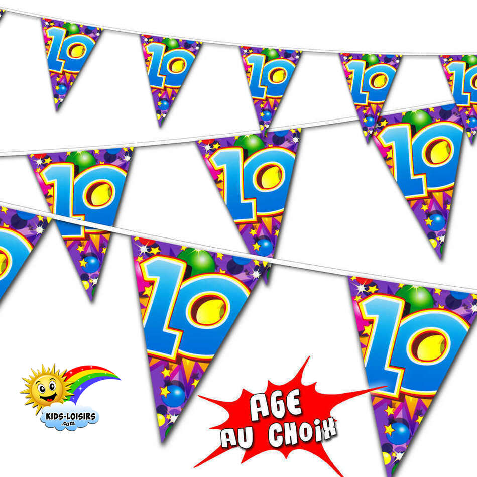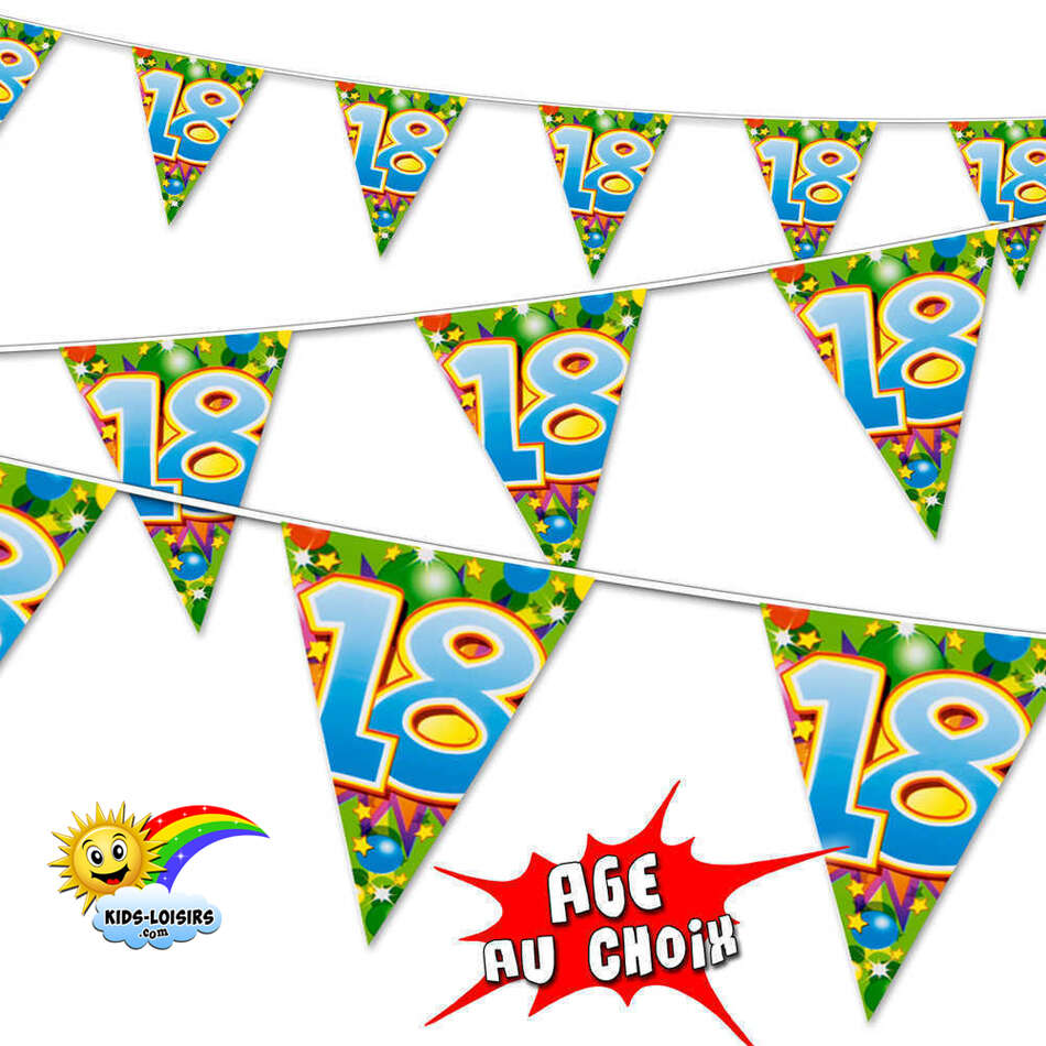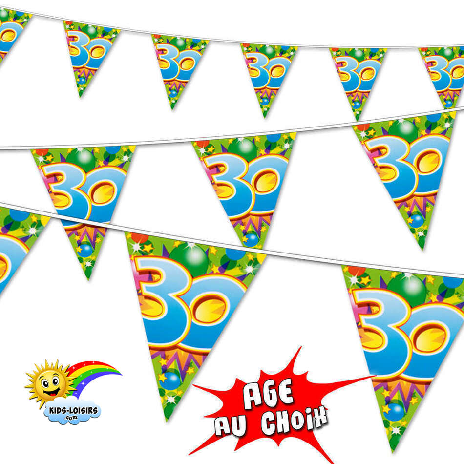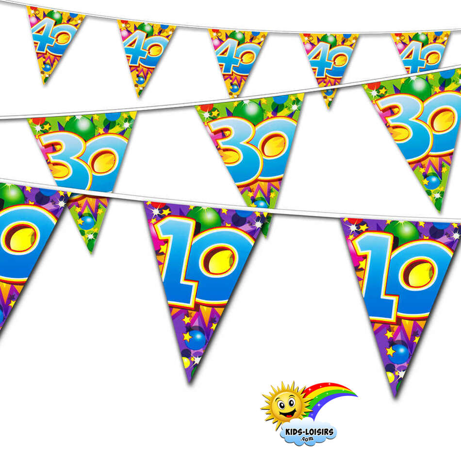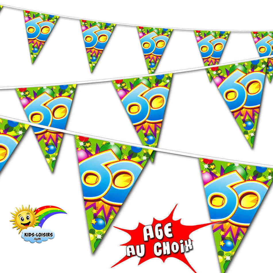 Matière plastique, longueur 6 mètres, 15 pavillons (fanions) triangulaires de 20 x 30 cm, imprimés sur une seule face. Âge au choix, prix unitaire pour une guirlande.