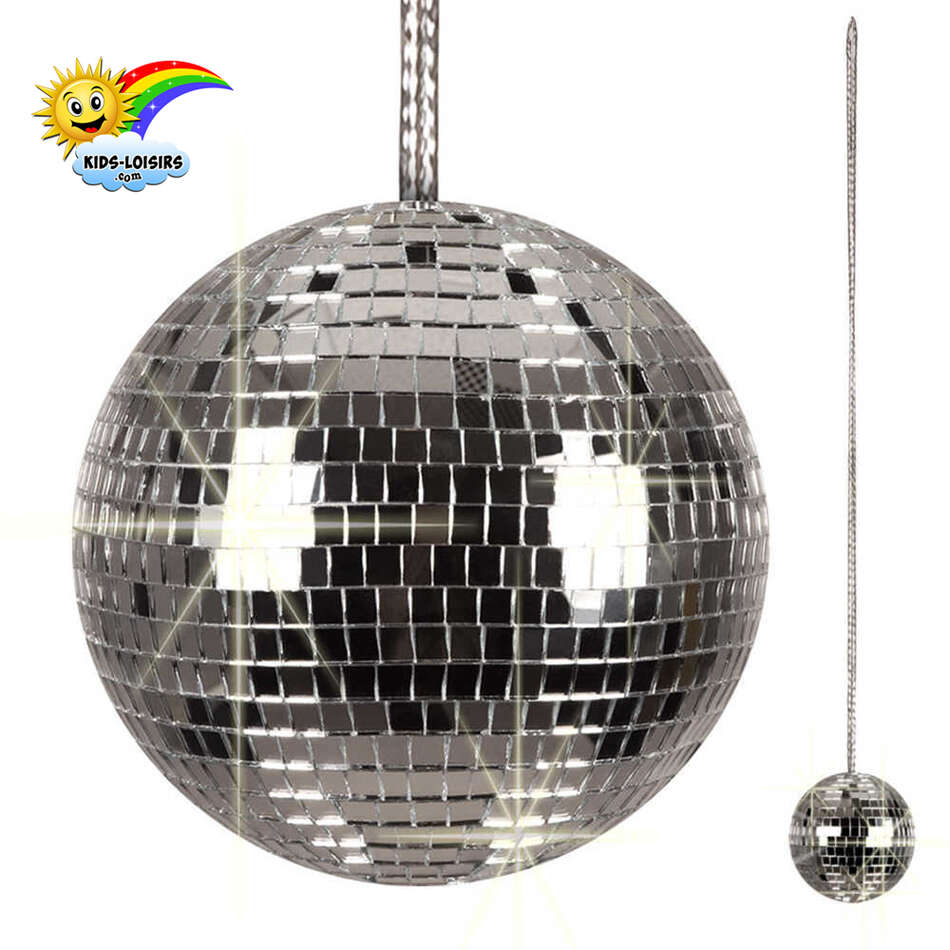 Petits éclats de miroirs brillants répartis autour d’une sphère en polystyrène, diamètre 4 cm, longueur fil argenté 45 cm.