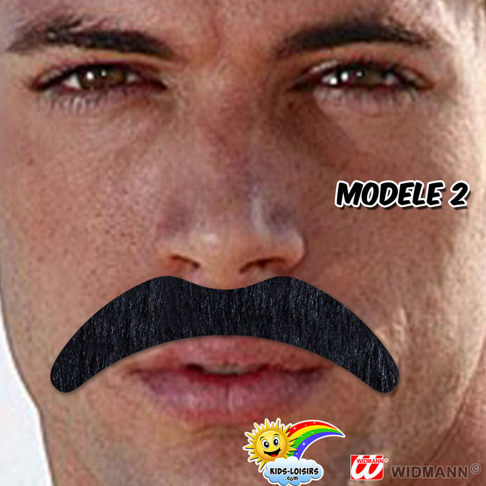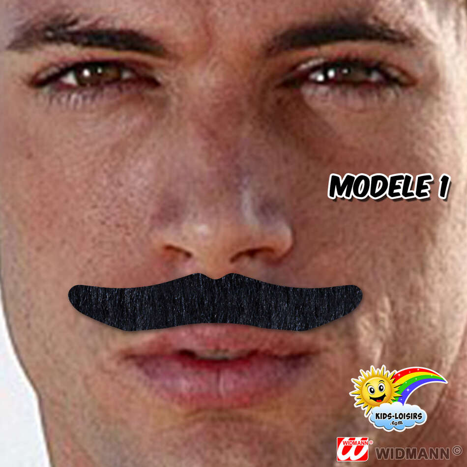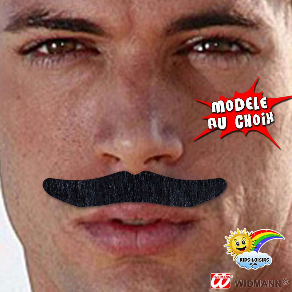 Fausse moustache brune (noire), qualité économique. Postiche autocollant réutilisable à volonté, qualité professionnelle, poils synthétiques, conditionnée sous blister. Modèle au choix parmi différentes formes, prix unitaire.