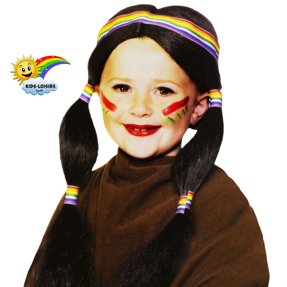 perruque indienne amérindienne pocahontas squaw brune femme fille bandeau nattes couettes déguisement western far west tribu cheyenne comanches apaches iroquoise sioux plumes cowboys indigene sauvage calumet de la paix belle
