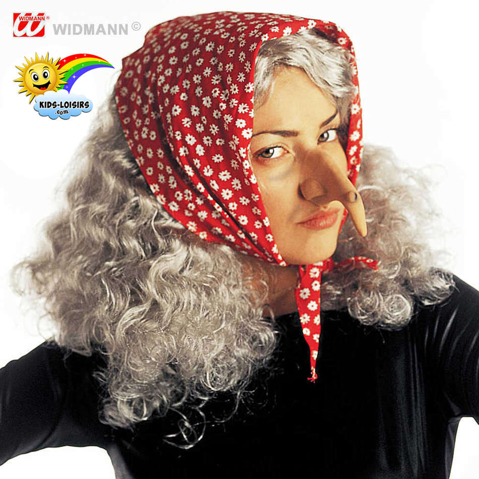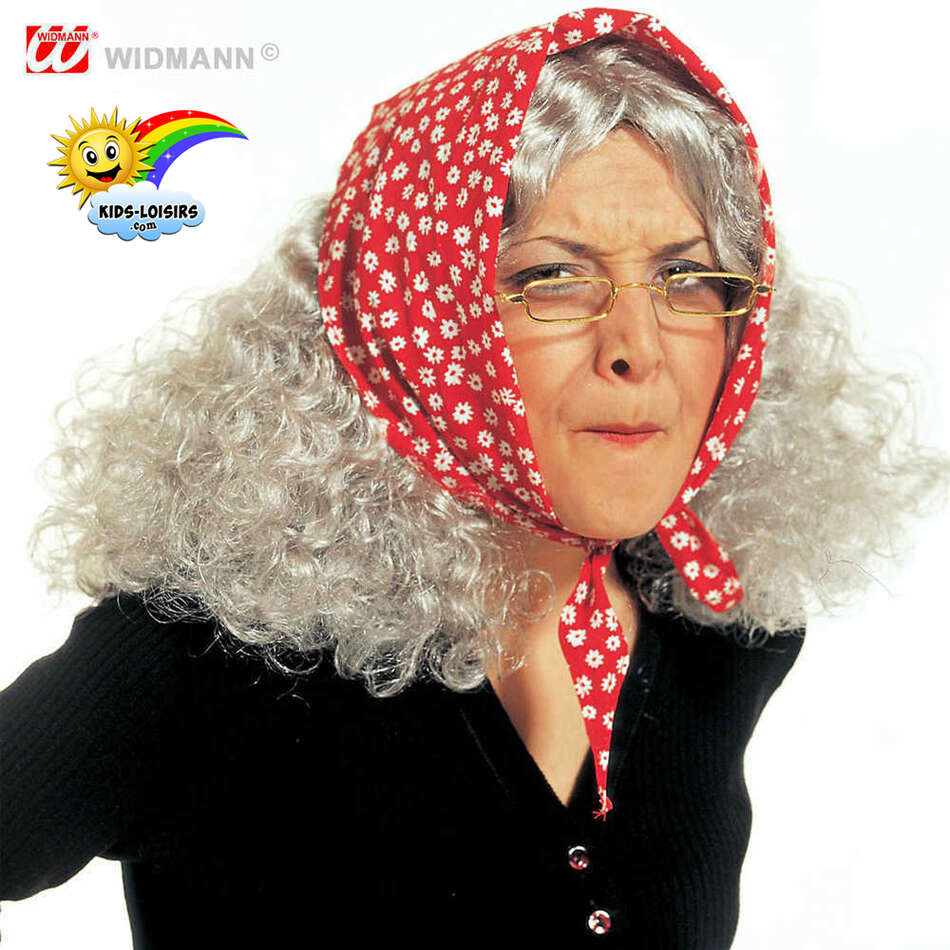 perruque grise foulard fichu grand-mère mémé vieille dame âgée cheveux chevelure accessoire de déguisement sorcière mamie mamy rides femme vieillarde ancienne ancêtre doyenne sénile retraitée vioque octogénaire septuagénaire canne déambulateur